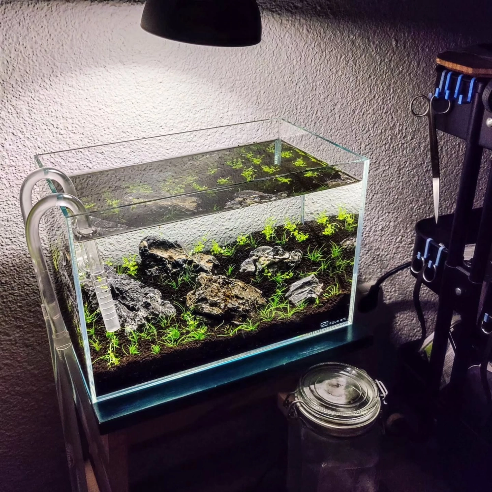 Mẫu hồ cá nhỏ phong cách Iwagumi với đá xanh và thảm cỏ rêu